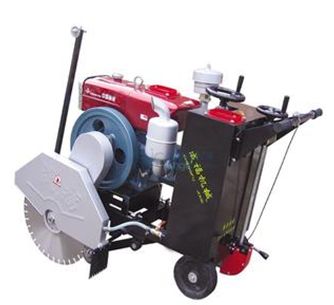 本切割機采用手推行走式切割送進。機頭主軸上安裝有金剛石鋸片,鋸片由電動機通過三角皮帶帶動。推把前端安裝有可調(diào)節(jié)切割深度的手輪,轉(zhuǎn)動手輪使前行走輪升降,從而調(diào)節(jié)鋸片高度;機身上部有盛水水箱。鋸片切割機前,應(yīng)擰開水管開關(guān),使管頭向鋸片兩邊噴水以進行冷卻并清除切縫泥污。